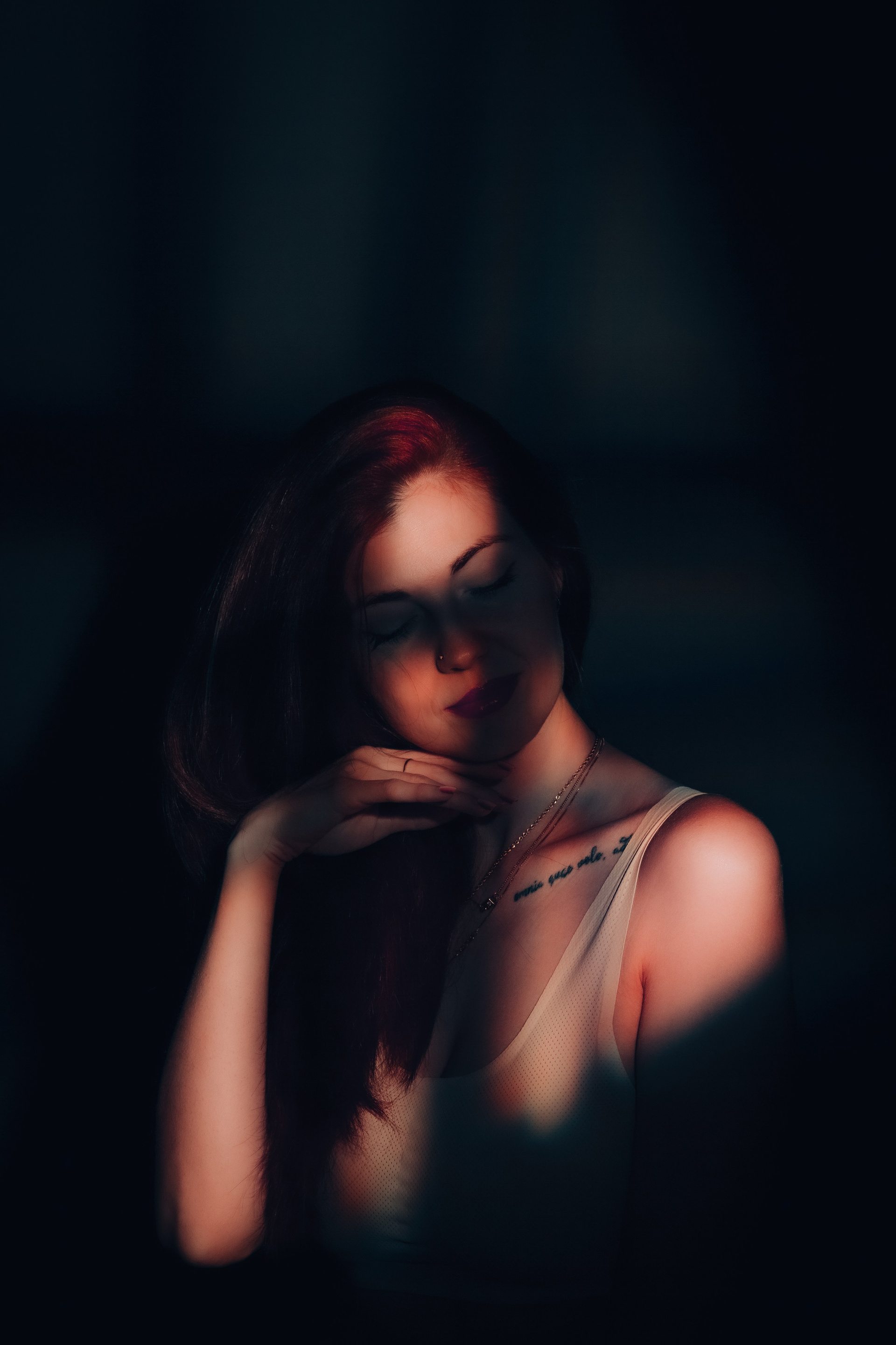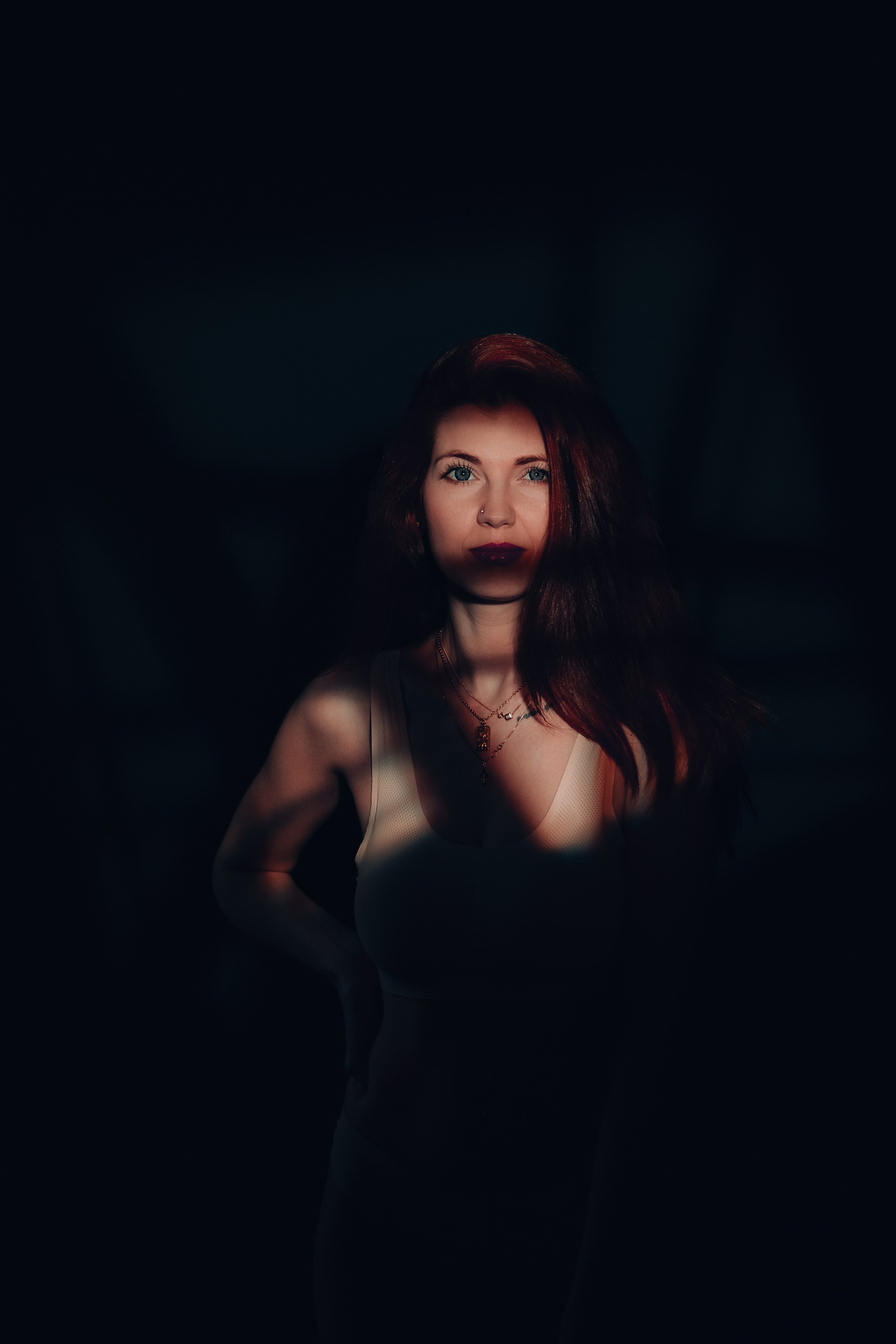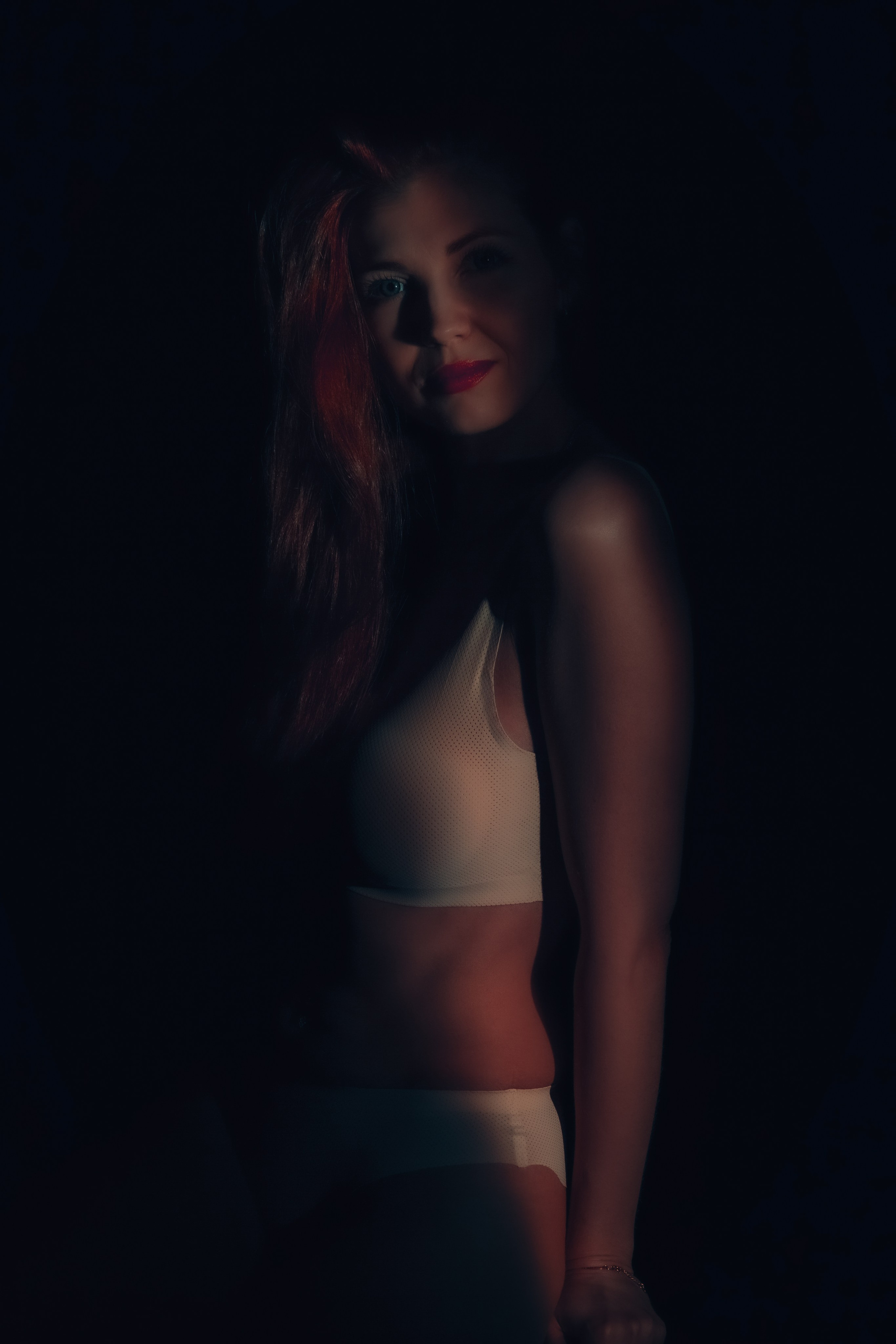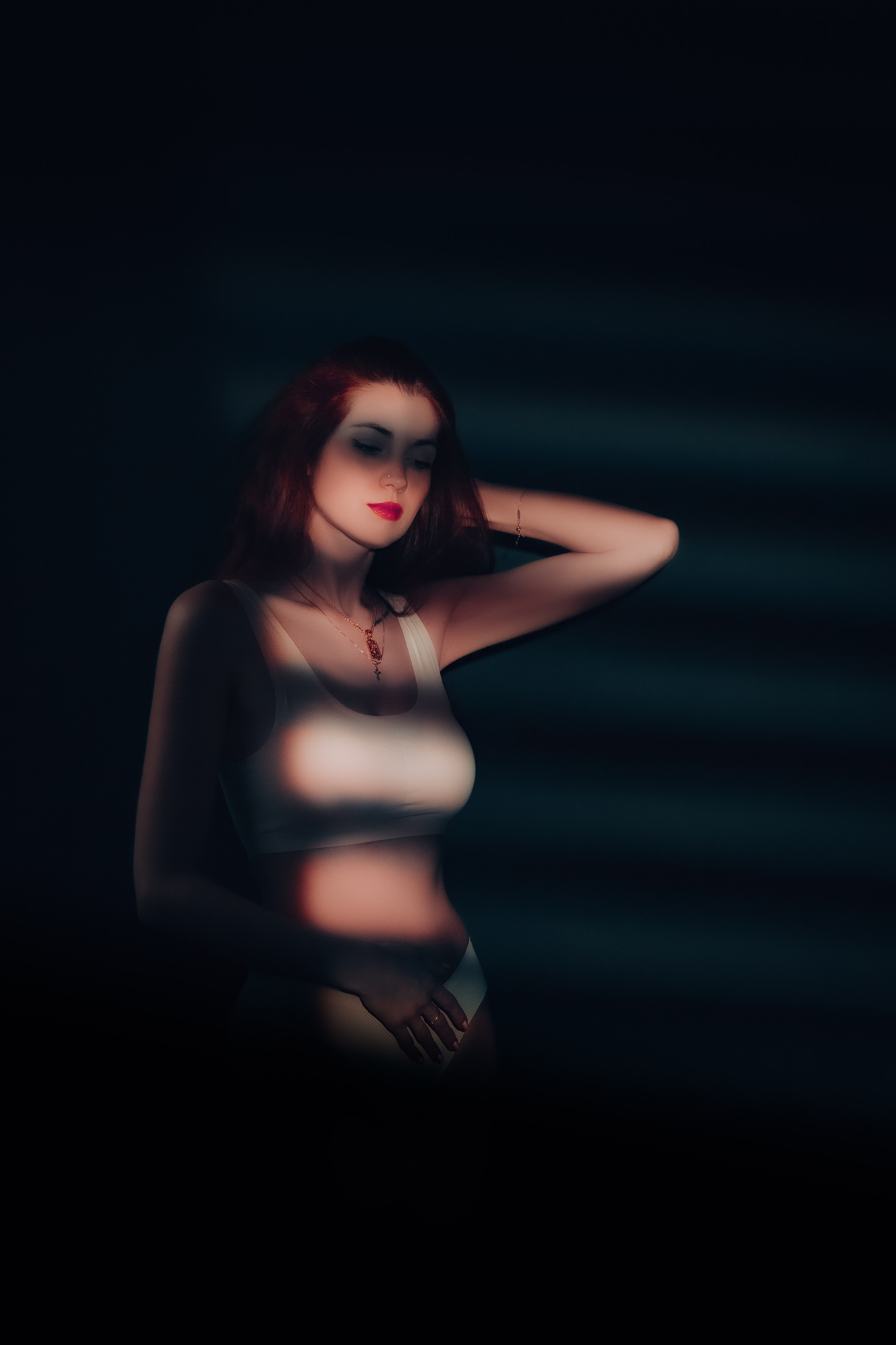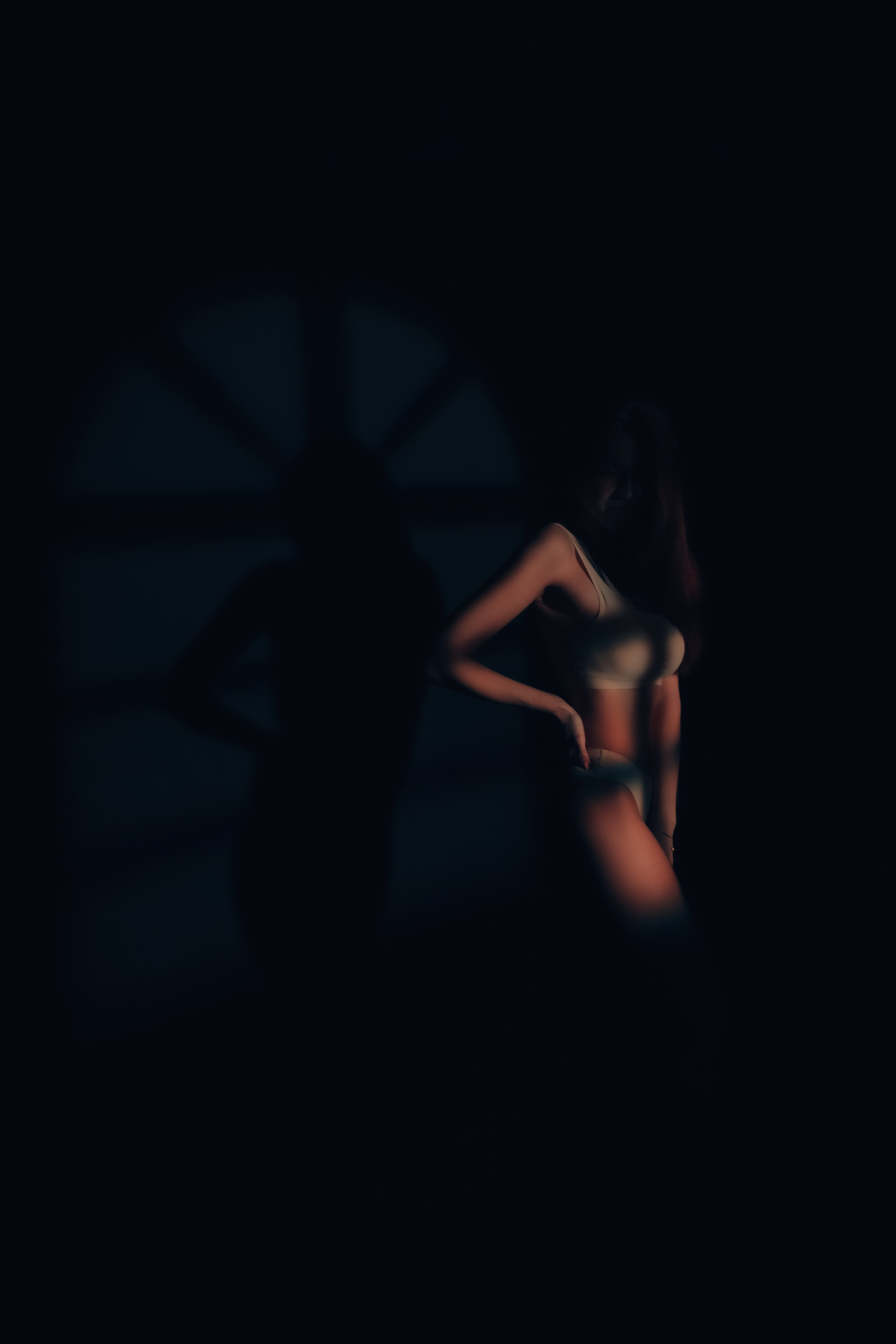 Изящество во тьме: прекрасная Екатерина в белье окутана мягким светом лучей солнца, создавая загадочную атмосферу темного вечера.